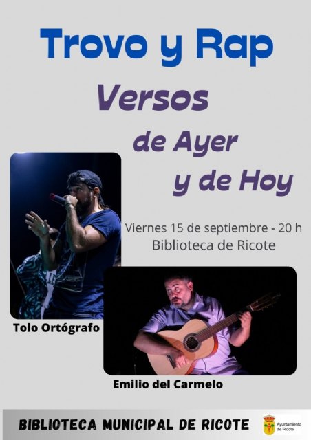 El 15 de septiembre abrirá el ciclo el trovo y el rap, con Versos de Ayer y de Hoy, de la mano de Tolo Ortógrafo, filólogo y rapero, y Emilio del Carmelo Tomás Loba, profesor, etnógrafo y pieza fundamental del folclore murciano. Nos mostrarán todo lo que tienen en común estos estilos a priori tan diferentes, y podremos verlos en un mano a mano. Será a las 20 h. en el hall del edificio, con aforo limitado.